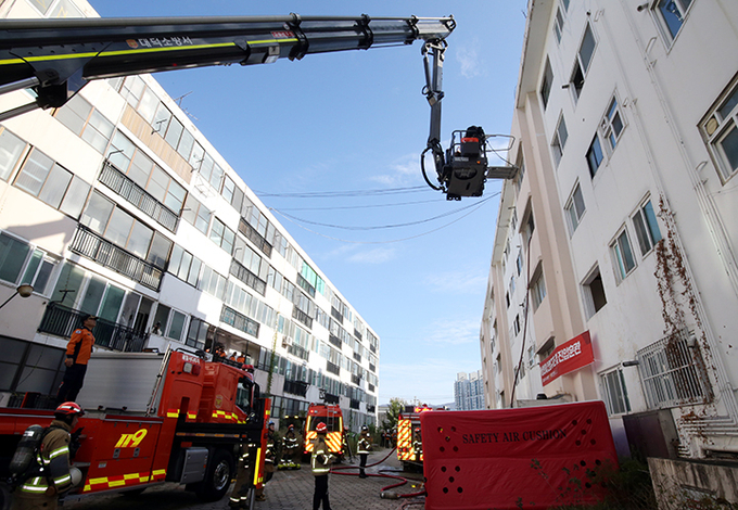 대전 대덕구 홍도동 철거 예정 아파트에서 대덕소방서 소속 소방대원들이 공동주택 가상화재 인명구조 및 진압훈련을 하고 있다. 2024.10.29 (ⓒ뉴스1)