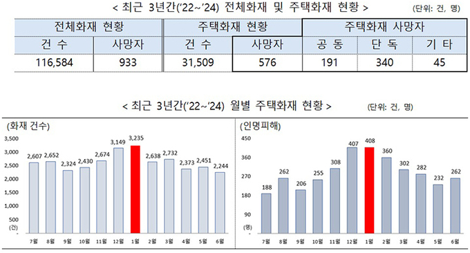 특히 1월에는 전체 주택화재의 10.3%(3235건)가 발생해 인명피해의 11.8%(사망75명, 부상333명)가 발생했다.