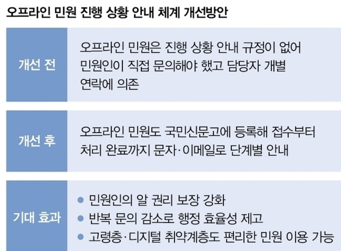 그동안 국민신문고를 통해 접수된 온라인 민원은 접수, 보완 요청, 처리 결과 등 각 단계별 진행 상황이 문자나 이메일로 자동 안내됐지만, 방문·우편 등 오프라인 민원은 관련 규정이 없어 민원인이 처리 과정을 확인하기 어려웠다.
