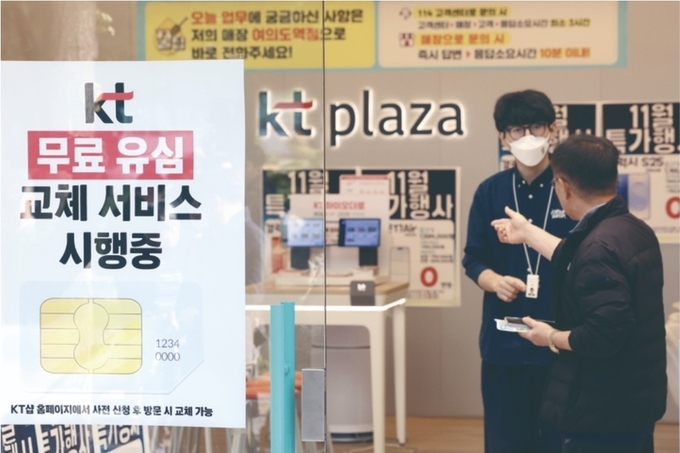 2025년 11월 5일 대규모 해킹이 발생한 KT가 피해 후속 대책으로 전 고객 대상 유심 무상교체를 시행한 첫 날 서울의 한 KT 대리점 모습. 사진 뉴시스