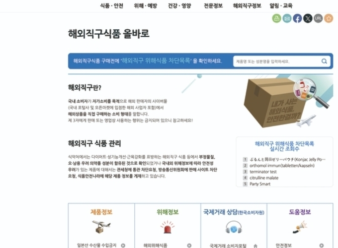 '해외직구식품 올바로'에는 소비자가 구매 전에 확인해야 할 ▲국내 반입차단 대상 원료·성분 정보 ▲위해식품 차단 목록 ▲해외직구식품 안전정보 등이 담겨 있어 제품명 또는 성분명을 검색하면 위해성분이 확인된 제품인지 등을 한눈에 확인할 수 있다.