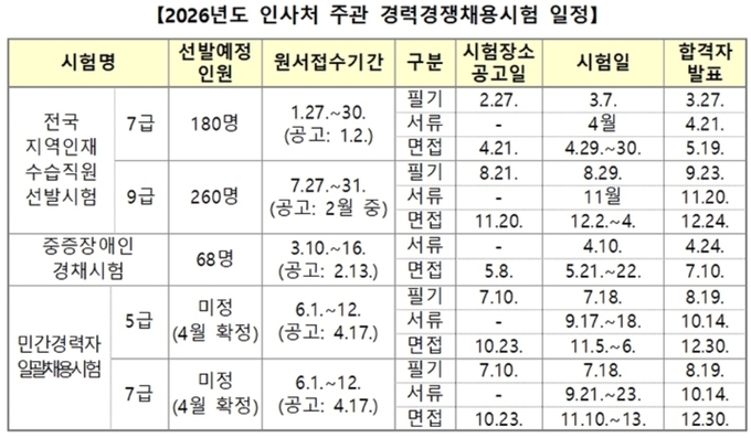 인사처가 주관하는 경력채용시험 원서접수는 오는 27일 지역인재 7급 선발을 시작으로 순차 진행된다. 이후 3월 10일 중증장애인 선발, 6월 1일 5·7급 민간경력자 일괄채용, 7월 27일 지역인재 9급 선발이 이어진다.
