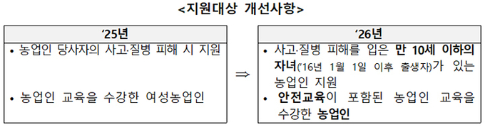 이번 제도 개선에 따라 농업인 본인의 사고·질병뿐 아니라, 자녀가 사고나 질병으로 돌봄이 필요한 경우에도 영농도우미를 신청할 수 있다.