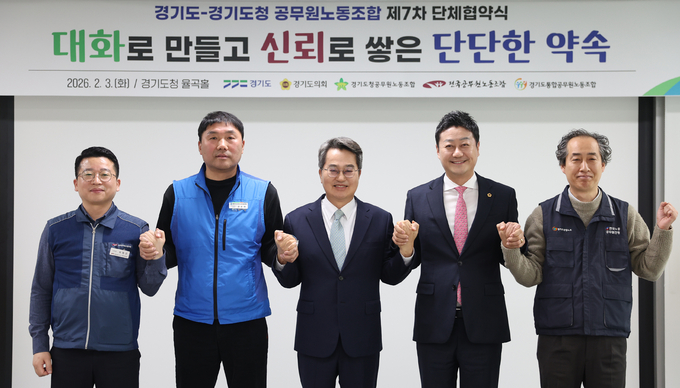 김동연 경기도지사와 김진경 경기도의회 의장, 강순하 경기도청공무원 노동조합 위원장, 백승진 경기도통합공무원노동조합 위원장, 최형곤 전국공무원노동조합 경기도청지부 사무국장은 3일 경기도청 율곡홀에서 제7차 단체협약서에 서명했다.