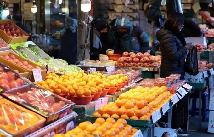정부가 역대 최대 규모의 공급·할인 대책을 담은 '2026년 설 민생안정 대책'을 발표한 28일 오전 서울 동대문구의 한 전통시장에서 시민들이 장을 보고 있다. 2026.1.28 (ⓒ뉴스1)