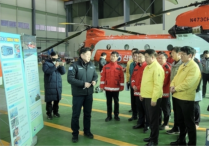 윤호중 행정안전부 장관이 산림재난 대응태세 현장점검을 위해 강원 원주시 산림항공본부를 방문해 산불진화 헬기를 살펴보고 있다. 2026.1.28 (ⓒ뉴스1)