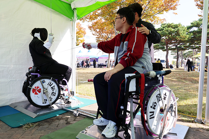 7일 광주광역시청에서 열린 2025 광주 장애인복지 통합박람회에서 한 시민이 휠체어 펜싱 체험을 하고 있다. 2025.11.7 (사진=연합뉴스)