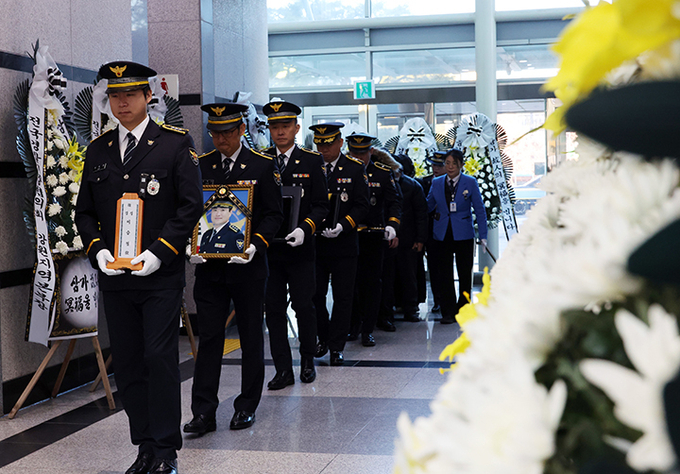 6일 전북경찰청 온고을홀에서 엄수된 고(故) 이승철 경정의 영결식에서 고인의 위패가 식장을 떠나고 있다. 2026.1.6 (사진=연합뉴스)