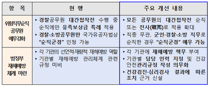 또한 경찰·소방이 아닌 공무원이라도 군인, 경찰, 소방의 직무를 수행하다 위험직무로 순직한 경우 '국가유공자법'에 따른 순직군경으로 예우할 수 있도록 절차와 법적 근거를 명확히 했다.