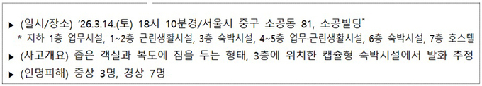 특히 방문객 밀집이 예상되는 종로구·중구 숙박시설과 서울 시내 전체 캡슐형 시설에 대해서는 긴급 특별소방검사를 진행한다.