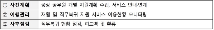 전담 관리자는 개인 상태에 맞게 필요한 서비스를 안내하고 이용현황을 관리하며 직무 복귀 상황을 점검하는 등 공상 공무원을 단계별로 관리하게 된다.