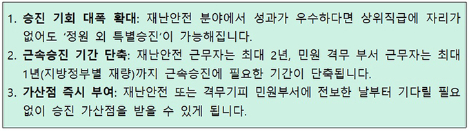 먼저 가장 큰 변화는 승진 기회의 확대로, 기존에는 상위직급에 결원이 있어야만 특별승진이 가능했으나 앞으로는 재난안전 분야에서 우수한 성과를 거두거나 해당 분야에서 정부포상을 받은 7급 이하 공무원에게 '정원 외 특별승진' 기회를 부여한다.