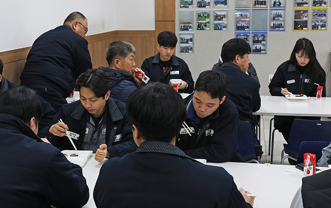 ▲ 11일 오전 경남 김해시 진례면 케이피항공산업 노동자들이 정부와 경남도, 김해시가 지원하는 '천원의 아침밥' 사업으로 식사하고 있다. 2026.3.11 (사진=연합뉴스)