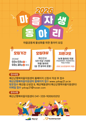 [예산/오창환기자] 예산군행복마을지원센터는 마을에 활력을 불어넣고 마을공동체 회복을 도모하기 위해 2026년 마을자생동아리를 3월 20일까지 모집한다고 밝혔다. 마을자생동아리 지원사업은 마을 고유의 특성에 맞는 동아리 활동을 지원해 마을의 정체성을 확립하고 지속적인 공동체 활성화를 유도하기 위한 사업이다. 센터는 관내 마을을 중심으로 활동하는 5인 이상 동아리 가운데 마을만들기 활성화를 위한 마을 단위 동아리를 우선 선정할 예정이다. 신청 분야는 마을만들기 소규모 활동으로 △문화복지 △환경개선 △소득창출 등이며, 총 14개 동아리를 선정해 사업비를 차등 지원하고 선정된 동아리는 회계·정산 교육을 이수한 뒤 본격적으로 사업을 추진하게 된다. 신청은 3월 20일까지 센터 누리집(https://www.yshap21.or.kr), 전자우편(yshap21@naver.com) 또는 방문(예산군 예산읍 산성길 8, 예산해봄센터) 접수하면 되며, 자세한 사항은 행복마을지원센터(041-333-9200, 0212)로 문의하면 안내받을 수 있다. 오윤석 센터장은 “주민이 중심이 되는 동아리 활동은 마을공동체 회복의 출발점”이라며 “앞으로도 다양한 주민 주도 활동이 지속적으로 이