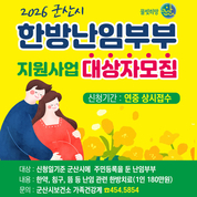 [군산/김주창기자] 군산시보건소는 난임으로 어려움을 겪고 있는 부부의 경제적 부담을 완화하고 건강한 임신과 출산을 지원하기 위해 ‘한방 난임부부 지원사업’ 참여자를 모집한다. 본 사업은 1인당 180만 원 상당의 한약·침·뜸 등 한방치료를 제공하여 난임 극복을 돕는 사업이다. 지원대상은 신청일 기준 군산시에 주민등록을 둔 난임부부로, 소득과 관계없이 신청할 수 있으며, 모집 인원은 총 27명으로 연중 선착순으로 충원 시까지 접수한다. 신청은 군산시보건소 방문 접수로 진행되며, 구비서류는 ▲주민등록등본 ▲정부 지정 난임시술 의료기관의 난임진단서 또는 난임을 확인할 수 있는 산부인과 일반 진단서 및 관련 검사 결과지(자궁 및 난관검사, 난소기능검사, 정액검사) ▲신분증이다. 선정된 대상자는 4개월간 한방 난임 치료와 2개월간 추적조사(총 6개월)에 참여해야 하며, 해당 기간에는 한방 난임 치료 외 다른 난임 시술을 병행할 경우 지원이 제한된다. 기타 자세한 사항은 군산시보건소 가족건강계(☎454-5854)로 문의하면 된다.