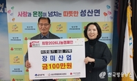 [군산/김주창기자] 군산시 성산면행정복지센터(면장 진미영)는 26일 성산면 소재 장미산업(대표 문정욱)이 지역의 어려운 이웃을 위해 100만 원의 성금을 기탁했다고 밝혔다. 장미산업은 생활용품 제조 및 유통을 주력으로 하며, 다양한 사회공헌 활동을 통해 기업의 사회적 책임을 실천하고 있으며, 지난 4월에도 산불 이재민을 위해 성금 100만 원을 기부하여 선한 나눔을 실천했다. 이번 성금은 동절기 취약계층과 소외된 주민들에게 전달될 예정으로, 따뜻한 겨울나기에 큰 힘이 될 예정이다. 기탁식에 참석한 문정욱 대표는 “지역에서 받은 사랑을 다시 나누는 것이 기업의 책무라고 생각한다.”라며 “앞으로도 도움이 필요한 분들에게 희망을 전할 수 있도록 사회공헌 활동을 이어가겠다.”라고 말했다. 진미영 성산면장은 “매년 지역사회에 따뜻한 마음을 전해주신 장미산업에 깊이 감사드린다.”라며 “기탁된 성금은 도움이 필요한 분들에게 소중히 전달하겠다.”라고 전했다. 한편 성산면은 이번 성금 기탁이 성산면의 이웃사랑 문화를 더욱 굳건히 하는 계기가 될 것으로 기대하고 있다.