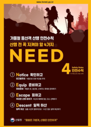 산림청(청장 김인호)은 본격적인 가을 단풍철을 맞아 전국에서 산행을 즐기는 국민들이 안전하게 등산할 수 있도록 반드시 지켜야 할 산행 안전수칙을 마련했다고 2일 밝혔다. 최근 가을철 등산 인구가 증가하면서 추락, 실족, 탈진 등 각종 산악사고가 꾸준히 발생하는 가운데 산림청은 국민들이 기억하기 쉽도록 산행 안전수칙 4가지(NEED)를 마련했다. * 최근 5년간(19~23년) 산악사고는 연평균 10,681건 발생 첫 번째는 확인하는(Notice) 것으로 기상 상황과 산행정보를 미리 확인하고, 낙엽,낙석 등 미끄럼 사고에 주의한다. 두 번째는 준비하는(Equip) 것으로 계절과 기온 변화에 맞는 등산화, 여벌 옷, 스틱 등 필수 장비를 갖추고, 충분한 식수와 간식을 준비한다. 세 번째는 피하는(Escape) 것으로 무리한 산행은 피하고, 자신의 체력에 맞는 코스를 선택해 안전하게 산행한다 마지막은 일찍 하산하는(Descent) 것으로 가을은 일몰 시간이 빨라 어두워지기 전에 하산해야 하므로, 오후에는 늦지 않게 하산을 시작한다. 정가인 한국등산트레킹지원센터 숲길관리실장 “가을철 갑작스러운 기상 변화로 저체온증이나 탈수의 위험이 높다.”라며, “체온을 유지할 수