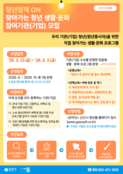 [군산/김주창기자] 군산시는 청년의 일·생활 균형을 지원하고 현장 중심의 정책 체감을 높이기 위해 ‘청년정책 ON: 찾아가는 청년 생활·문화’ 프로그램에 참여할 기관(기업)을 4월 3일까지 모집 중이라고 밝혔다. 이번 사업은 바쁜 일정 등으로 청년센터 방문이 어려운 청년들을 위해 전문가가 직접 기관과 기업, 학교 등 현장을 찾아가 맞춤형 교육과 청년정책을 안내하는 프로그램이다. 모집 대상은 군산시 관내 기관(기업), 고등학교, 대학교 등이며, 소속 청년(재직자 및 재학생) 10명 이상 참여가 가능하고 프로그램 운영 장소를 제공할 수 있는 곳이면 신청할 수 있다. 선정된 기관(기업)에는 약 3시간 내외의 맞춤형 프로그램이 전액 무료로 제공된다. 프로그램은 군산시 주요 청년정책 안내 및 청년 애로사항 청취를 포함한 필수 과정과 함께, 재무관리, 멘탈케어, 힐링 프로그램, 자기계발 등 다양한 선택 과정 중 1개를 선택해 운영된다. 프로그램은 신청 기관과의 일정 협의를 통해 3월부터 10월까지 순차적으로 운영되며, 현장에서 수렴된 청년들의 의견은 관련 부서에 전달하고 필요 시 전문기관 연계 등 후속 지원도 병행할 계획이다. 시 관계자는 “이번 프로그램을 통해 지역