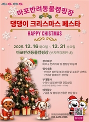 마포구(구청장 박강수)는 연말을 맞아 2025년 12월 16일부터 12월 31일까지 난지한강공원 내 마포반려동물캠핑장에서 반려동물과 특별한 연말 추억을 만들 수 있는 '댕댕이 크리스마스 페스타'를 개최한다. 행사가 열리는 마포반려동물캠핑장은 한강뷰 산책로와 반려동물 전용 놀이터, 프라이빗 데크와 텐트 등을 갖춘 도심 속 반려 가족 힐링 공간으로, 반려견이 자연 속에서 마음껏 뛰어놀 수 있어 많은 반려 가족이 찾는 명소다. 마포반려동물캠핑장은 이번 크리스마스 기간 동안 캠핑장 전체를 성탄 분위기로 꾸미고, 포토존을 확대해 방문객들에게 특별한 겨울 추억을 선사할 계획이다. 이번 '댕댕이 크리스마스 산타 페스타' 기간에는 반려견 산타복·크리스마스 의상과 각종 소품을 비치하고, 보호자가 직접 준비한 크리스마스 의상도 함께 활용할 수 있도록 해 반려견 성탄 복장 체험과 포토존 인증샷 이벤트를 진행한다. 참가자들은 캠핑장 곳곳에 조성된 트리 장식과 트러스 포토존 등에서 크리스마스 콘셉트로 자유롭게 사진을 촬영한 뒤, 개인 SNS에 후기를 게시하고 이벤트에 참여할 수 있다. 이 가운데 우수 후기 30팀을 선정해 프리미엄 반려동물 장난감과 사료 등 경품을 제공할 예정이다.
