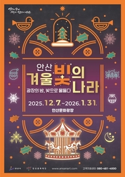 안산시(시장 이민근)는 주말인 오는 7일을 시작으로 내년도 1월 31일까지 두 달여 간 고잔동 안산문화광장 일대에서 겨울 야간 축제, '2025 안산 겨울 빛의 나라'를 개최한다고 1일 밝혔다. '2025 안산 겨울 빛의 나라' 축제는 시민과 관광객에는 화려한 조명으로 가득찬 문화광장의 아름다운 풍경을, 침체한 지역 경제에는 새로운 활력을 제공하고자 기획됐다. 시는 안산문화광장 내 '물의 광장'부터 '갤러리 광장'에 이르기까지 약 1km 구간을 빛 조형물과 다채로운 포토존으로 구성, 시민들에게 잊지 못할 겨울 추억을 선사한다. ■ 12월 7일 점등식 개최…볼거리·즐길 거리 풍성 축제의 화려한 시작을 알리는 개막 점등식은 오는 7일 오후 4시 50분, 안산문화광장 썬큰광장에서 열린다. 안산시립합창단의 식전공연을 비롯해 점등 퍼포먼스, 가수 호림과 핫(HOT) 서커스 아트네이블의 공연이 진행돼 축제 분위기를 한층 고조시킨다. 이날 안산국제거리극축제 공식 인스타그램 팔로워 900명(선착순 한정)에 호빵을 증정하는 특별 이벤트도 진행된다. 축제 기간에는 빛 조형물뿐만 아니라, 회전목마(12월 주말 및 성탄절 운영, 유료), 체험 프로그램, 특별공연, 스노우 쇼(매주
