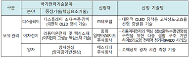 [한국방송/진승백기자] 과학기술정보통신부와 한국과학기술기획평가원(KISTEP)은 올해 제1차 국가전략기술 확인 신청에 대해 디스플레이, 이차전지, 양자 분야의 기술 총 3건이 국가전략기술에 해당하는 것으로 확인했다고 31일 밝혔다. '국가전략기술 확인제도'는 '국가전략기술 육성에 관한 특별법' 제9조에 따라 기업, 대학, 연구기관 등의 기술육성주체가 보유·관리하고 있거나 연구개발 중인 기술이 '육성법' 상 '국가전략기술'에 해당하는지 여부를 확인하는 제도로, 이번 차수에는 총 38건의 기술이 신청되어 산·학·연 기술 전문가의 기술심사가 이뤄졌다. 2026년도 제1차 국가전략기술 확인 결과(표=과기정통부 제공) 먼저, 디스플레이 분야에서는 '데포랩'이 보유·관리하고 있는 '대면적 OLED 증착용 고해상도·고효율 선형 증발원 기술'이 국가전략기술 디스플레이 분야의 세부중점기술인 디스플레이 소재·부품·장비에 해당하는 것으로 확인됐다. 이 기술은 대면적 유기발광다이오드(OLED) 패널 박막증착 공정의 증착기 부품성능을 향상해 디스플레이의 고해상도 및 고휘도를 구현하고 공정효율을 개선한다. 이어서 이차전지 분야에서는 '화일렉트로라이트'가 보유·관리하고 있는 '리튬이차