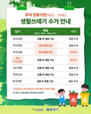 [경산/김근해기자] 경산시(시장 조현일)는 추석 연휴기간 중 시민불편을 최소화하기 위해 9월 22일부터 10월 9일까지 “생활쓰레기 처리 종합대책”을 추진한다고 29일 밝혔다. 시는 추석 연휴 전까지 환경정비를 실시하여 배출된 쓰레기는 전량 수거 처리할 계획이다. 연휴 기간 중 시청 종합상황반과 읍‧면‧동 기동 청소반을 설치하고 쓰레기 수거 5개 권역 대행업체도 긴급운영반을 편성‧운영해 긴급한 쓰레기 민원을 신속히 처리하여 시민 불편이 발생하지 않도록 관리할 방침이다. 또한, 쓰레기 처리시설 및 수거 대행업체 휴무로 연휴 기간 중 10월 5일부터 10월 6일은 쓰레기 수거가 중단됨에 따라 이날 발생된 쓰레기는 가급적 배출을 자재하고 가정에 보관했다가 수거 전날에 배출해 줄 것을 당부하였다. 특히, 추석 다음 날 쓰레기가 한꺼번에 몰려 배출될 것이 예상됨에 따라 쓰레기 수거 5개 업체에서 청소 인력과 장비를 총동원하여 쓰레기를 전량 수거‧처리할 예정이다. 시 관계자는 “추석 연휴가 개천절 및 한글날을 포함해 7일간 지속됨에 따라 쾌적하고 깨끗한 명절 분위기 조성을 위해 무단투기를 자재하고 각 가정에서도 쓰레기 배출량 최소화하고 배출 일자 및 시간을 준수하여 배
