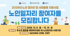 [군산/김주창기자] 군산시가 어르신들의 활기찬 노후생활과 사회참여 확대, 안정적 소득 확보를 지원하기 위한 「2026년 노인일자리 및 사회활동지원사업」참여자를 8일부터 19일까지 모집한다. 또한 일자리 수 역시 신노년세대 등의 다양한 요구에 대응하기 위해 682명 증가한 13,022명의 일자리를 ‘2026년 노인일자리 사업’에서 제공한다. 사업유형은 ▲노인 공익활동 사업(8,332명) ▲노인 역량 활용 사업(4,100명) ▲공동체사업단(290명) ▲취업지원(300명)으로 나뉜다. 단, 안전사고 발생률이 높은 노인 공익활동 사업의 경우 전년보다 292명 감소된다. 신청 자격은 △노인 공익활동 사업: 65세 이상 기초연금 수급자 △노인 역량 활용 사업은 65세 이상(일부 사업 60세 이상) △공동체사업단·취업지원은 60세 이상 어르신이면 가능하다. 신청은 8일부터 신분증, 주민등록등본, 관련 자격증 등 증빙서류를 준비해 주소지 읍면동 행정복지센터와 노인일자리 수행기관에 방문하거나 온라인을 통하면 된다. 온라인 신청은 한국노인인력개발원 노인일자리여기 (www.seniorro.or.kr), 복지로(www.bokjiro.go.kr) 를 통해 해야하며, 온라인으로 신청