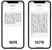[한국방송/김주창기자] '재난문자' 구체적 대응 방법 알려준다…중복·반복 송출 방지그동안 90자 이내로 제한되어 간단한 수준의 안내만 가능했던 '재난문자'가 최대 157자까지 늘어나 보다 구체적이고 상황에 맞는 정보를 제공한다. 행정안전부는 재난문자가 필요한 정보를 충분히 전달할 수 있도록 길이를 늘이는 바, 오는 31일부터 4개 지역에서 시범운영을 거쳐 전국으로 확대할 예정이라고 밝혔다. 아울러 중복·과다 송출을 방지하기 위해 운영방식도 단계적으로 개선할 방침이다. 개선되는 재난문자 예시 (이미지=행정안전부) 먼저 재난문자는 최대 157자로 확대해 시민들에게 재난정보를 더 구체적이고 이해하기 쉽게 전달한다. 다만, 대피명령 등 긴급한 상황의 재난문자는 2019년 이전 출시된 구형 휴대전화의 경우 157자 수신이 불가능한 점을 고려해 기존 90자 체계를 유지한다. 한편 유사·중복 재난문자가 피로감을 주거나 경각심을 둔화시키지 않도록 재난문자 발송 시스템에 '송출 전 중복 검토 기능'을 새로 도입한다. 이에 앞으로는 동일 지역에 같은 재난유형의 문자가 24시간 이내에 반복 송출될 경우 시스템이 자동으로 중복 여부를 감지하고 발송자에게 발송 여부를 한 번 더 확