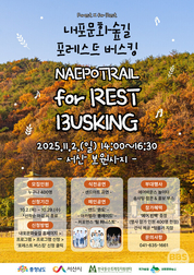 깊어가는 가을날 고즈넉한 천년 산사 옛터에서 알록달록한 ‘가을색 선율’을 만날 수 있는 보기 드문 무대가 열린다. 충남도와 사단법인 내포문화숲길은 다음 달 2일 오후 2시 서산 보원사지 일원에서 ‘내포문화숲길 포레스트 버스킹’ 행사를 개최한다고 16일 밝혔다. 이번 행사는 국가숲길이자 충남 대표 숲길인 내포문화숲길에서 가을의 정취와 함께, 자연 속 휴식과 문화가 공존하는 시간을 선사하기 위해 마련했다. 버스킹에는 어쿠스틱 밴드 ‘온도’와 아카펠라 그룹 ‘튠에이드’, 퍼포먼스 그룹 ‘팀 퍼니스트’ 등 다양한 장르의 팀이 출연, 관람객들에게 따뜻하면서도 생기 넘치는 무대를 선사할 예정이다. 또 행사장 인근에는 어린이들을 위해 에어바운스 놀이터를 설치하고, 솜사탕·팝콘 간식 부스와 국가숲길·동서트레일·내포문화숲길 홍보 부스도 함께 운영하며 가족 단위 방문객들의 즐거움을 더할 계획이다. 공연은 무료이나, 내포문화숲길 누리집(http://www.naepotrail.org)을 통해 행사 참여를 사전에 신청하면, 선착순 400명까지 기념품을 받을 수 있다. 이용길 충남도 산림휴양과장은 “숲과 문화가 어울린 버스킹을 통해 도민에게 휴식과 힐링의 시간을 선사하고, 내포문화숲