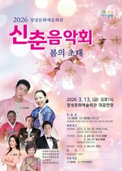 창녕군은 오는 3월 13일 오후 7시, 창녕문화예술회관 대공연장에서 2026 신춘음악회 '봄의 초대'를 개최한다. 이번 공연은 김현호 지휘자가 이끄는 영남국악관현악단의 연주 아래, 대중가수 신승태와 현옥, 신정화를 비롯해 테너 하세훈, 판소리꾼 마포로르 등 실력파 아티스트들이 총출동한다. 여기에 (사)송엽판소리보존회, 노리광대, 아리랑보존회의 역동적인 무대가 더해져 국악과 현대음악을 아우르는 풍성한 볼거리를 제공할 예정이다. 군 관계자는 "이번 신춘음악회가 긴 겨울을 지나 새봄을 맞이하는 군민들의 일상에 따뜻한 활력을 불어넣는 소중한 시간이 되길 바란다"며 "이번 공연을 기점으로 군민과 예술회관 회원들을 위한 문화 혜택을 더욱 확대해 나갈 계획이니 많은 관심과 사랑을 부탁드린다"고 전했다. 예매는 2월 23일 오전 10시부터 시작되며, 창녕군민과 문화누리 회원(유료회원)을 대상으로 현장 예매부터 우선 진행된다. 공연에 관한 자세한 사항은 창녕문화예술회관 누리집(www.cng.go.kr/art.web) 또는 전화(055-530-1911)로 문의하면 된다.