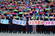 [한국방송/김주창기자] 정부가 전남광주통합특별시 출범을 앞두고 특례 운영기준을 담은 시행령 제정에 착수한다. 행정안전부는 이달 31일부터 5월 11일까지 41일간 '전남광주통합특별시 설치를 위한 특별법 시행령 제정안'과 '지방자치법 시행령 개정안'을 입법예고한다고 밝혔다. 이번 시행령 제정은 3월 5일 공포된 '전남광주통합특별시 설치를 위한 특별법'의 시행(7월 1일)에 앞서, 법에서 위임한 사항과 세부 운영기준을 마련하기 위한 것이다. 강기정 광주광역시장과 김영록 전남도지사가 3일 전남 나주시 한국에너지공과대학교 대강당에서 열린 '광주전남 행정통합 시도민보고회'에서 참석자들과 기념촬영을 하고 있다. 2026.3.3 (사진=광주광역시) 제정안은 총 82개 조문으로 구성되며, 일반행정 16개, 교육자치 16개, 도시개발 7개, 산업활성화 27개, 기타 15개 조문으로 분야별 특례의 구체적인 운영기준을 담았다. 일반행정 분야에서는 국무총리 소속 전남광주통합특별시 지원위원회의 구성과 운영방식을 규정하고, 위원회 참석 대상 중앙행정기관장의 범위, 위원장 직무, 의결 정족수 등을 명확히 했다. 교육자치 분야에서는 통합특별시교육감이 지정·설립할 수 있는 영재학교의 외국