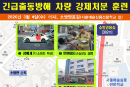 [서울/박기문기자] 서울특별시 소방재난본부(본부장 홍영근, 이하 본부)는 4일(수) 오후, 서대문구 홍제동 소재 명예 도로명인 소방영웅길 일대에서 소방차 출동로 확보와 신속한 현장 대응력 강화를 위한 ‘긴급출동 방해 차량 강제처분’에 대한 공개 훈련을 진행했다고 밝혔다. 이번 훈련은 지난 2001년 3월 서대문구 홍제동에서 발생한 방화사건 시 좁은 골목과 불법 주정차 차량으로 인해 소방차 진입이 지연되었던 사례를 반면교사(反面敎師) 삼아 추진됐다. 해당 사건은 긴급출동로 확보의 중요성을 사회적으로 환기시킨 대표적 사례이며, 이번 훈련은 불법 주정차 등 소방차 통행을 방해하는 요소에 대한 엄정한 대응체계 확립을 목적으로 한다. 소방차량 및 폐차 등 총 10대의 차량과 인원 50여 명이 투입된 이날 시연회는, 긴급 출동에 장애가 되는 불법 차량에 대한 실제 집행력을 선보임으로써 시민들에게 소방차 출동로 확보가 곧 ‘생명의 길’임을 각인시키는 데 중점을 두었다. 현행 소방기본법 제25조에 따르면, 소방대장 등은 소방활동을 위해 긴급하게 출동할 때 통행이나 활동에 방해가 되는 주·정차 차량 및 물건 등을 제거하거나 이동시킬 수 있는 권한을 가진다. 이날 훈련은 총 5가지 상황을 가정해 강제처분 시나리오를 입체적으로 선보였다. ▲ 강제밀기: 불법 주차 차량으로 출동로가 막힌 상황에서 소방차로 주차 차량을 직접 밀어 통행로(폭 2.5m 이상) 확보 ▲ 강제이동: 화재건물 출입구를 가로막아 인명대피 및 내부 진입을 방해하는 차량의 창문을 파괴하고 기어를 조작해 강제 이동 ▲ 장애제거: 소화전 주변 5m 이내 불법 주차 차량의 창문을 파괴하고 소방호스를 관통시켜 소방용수 확보 ▲ 강제진입: 좁은 골목 입구를 막은 불법 주차 차량의 범퍼 등을 파손하며 소방차가 강제로 돌파 및 진입 ▲ 손실보상: 강제처분 후 차주의 이의제기(보상요구) 상황을 가정하여 전담부서가 후속 조치 및 보상 가능 범위 안내 등의 순으로 진행됐다. 본부 관계자에 따르면 “심야 시간대 주택가 이면도로에 무심코 세워둔 차량이 소방활동의 골든타임을 뺏는 치명적인 걸림돌이 될 수 있다”며 “소방활동에 지장을 줄 경우 예외 없는 강제처분이 불가피한 만큼 시민들의 각별한 주의와 협조가 필요하다”고 강조했다. 한편, 최근 5년간(2021~2025년) 25개 소방서의 불법 주·정차 차량 단속 실적은 총 2,421건, 일반차량이 소방차량의 우선 통행을 방해한 경우도 34건으로 나타나 긴급 출동로 확보에 대한 시민들의 인식 개선과 자발적인 협조가 필요한 것으로 분석됐다. 〈최근 5년간(`21년 ~ `25년) 서울시 소방기관 불법 주‧정차 및 우선 통행 방해 단속 건수〉 (단위 : 건) (출처 : 서울소방재난본부) 아울러 본부는 현장 대원들이 민원이나 소송 부담 없이 적극적으로 강제처분에 임할 수 있도록 ‘119사법경찰팀’을 전담부서로 지정‧운영하고 있으며, 강제처분 후 발생할 수 있는 법적 분쟁과 후속 처리를 본부 차원에서 직접 대응하는 등 대원 보호를 위한 실효성 있는 지원체계도 마련했다. 홍영근 서울소방재난본부장은 “소방차 출동로 확보는 사랑하는 내 가족과 이웃의 생명을 지키는 ‘안전동행의 약속’이다”라며, “시민 여러분께서도 소방 출동로가 언제든 내 가족과 이웃에게 향할 수 있는 ‘생명의 길’임을 기억해 주시고, 소방차 출동로 확보에 많은 관심과 적극적인 참여를 당부드린다”고 말했다.