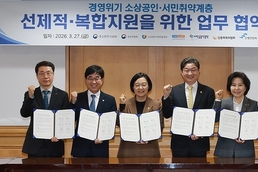 [한국방송/박기문기자] 정부가 경영 위기에 처한 소상공인 및 서민·취약계층이 '금융-고용-복지' 서비스를 한 번에 지원받을 수 있도록 선제적으로 나선다. 중소벤처기업부와 금융위원회는 27일 서울 중구 은행회관에서 '경영위기 소상공인 및 서민·취약계층에 대한 선제적이고 복합적인 지원을 위한 업무협약'을 체결했다고 밝혔다. 이날 협약 체결식에는 정부 외에도 소상공인시장진흥공단·신용보증재단중앙회 등 소상공인정책금융기관을 비롯해 서민금융진흥원·신용회복위원회 등 서민금융지원기관과 17개 민간은행을 대표한 은행연합회 등 총 7개 기관이 참석했다. 한성숙 중소벤처기업부 장관과 이억원 금융위원장이 27일 서울 중구 은행회관에서 '중기부-금융위-유관기관-은행권 업무협약'을 체결하고 기념촬영을 하고있다. 왼쪽부터 원영준 신용보증재단 중앙회 회장, 인태연 소상공인시장진흥공단 이사장, 한성숙 중기부 장관, 이억원 금융위원장, 김은경 서민금융진흥원장 겸 신용회복위원장, 조용병 은행연합회장.(사진=금융위 제공) 최근 폐업과 대출 연체율이 증가하는 등 많은 소상공인이 경영에 어려움을 겪고 있으나 지원이 적시에 이뤄지지 못하는 경우가 많다. 이에 중기부와 금융위는 부실·폐업 등 경영위기