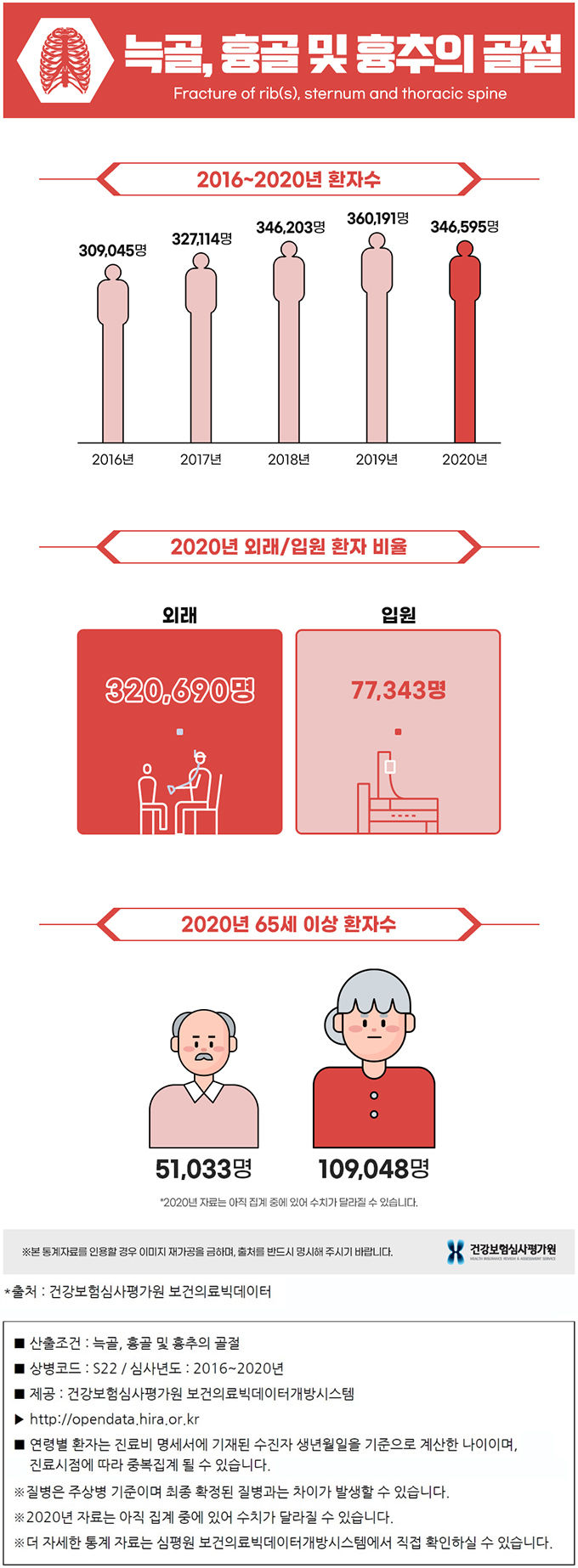 건강보험심사평가원의 통계에 따르면 2020년 늑골, 흉골 및 흉추의 골절로 병원을 찾은 수진자 중 19.4%가 입원하는 것으로 나타났습니다. 늑골, 흉골 및 흉추의 골절 환자 중 65세 이상 고령층이 45.4%를 차지했으며, 전체 연령층에서의 성별 간 차이는 적었지만 65세 이상 인구에서는 여성이 남성보다 2배 이상 많았습니다.