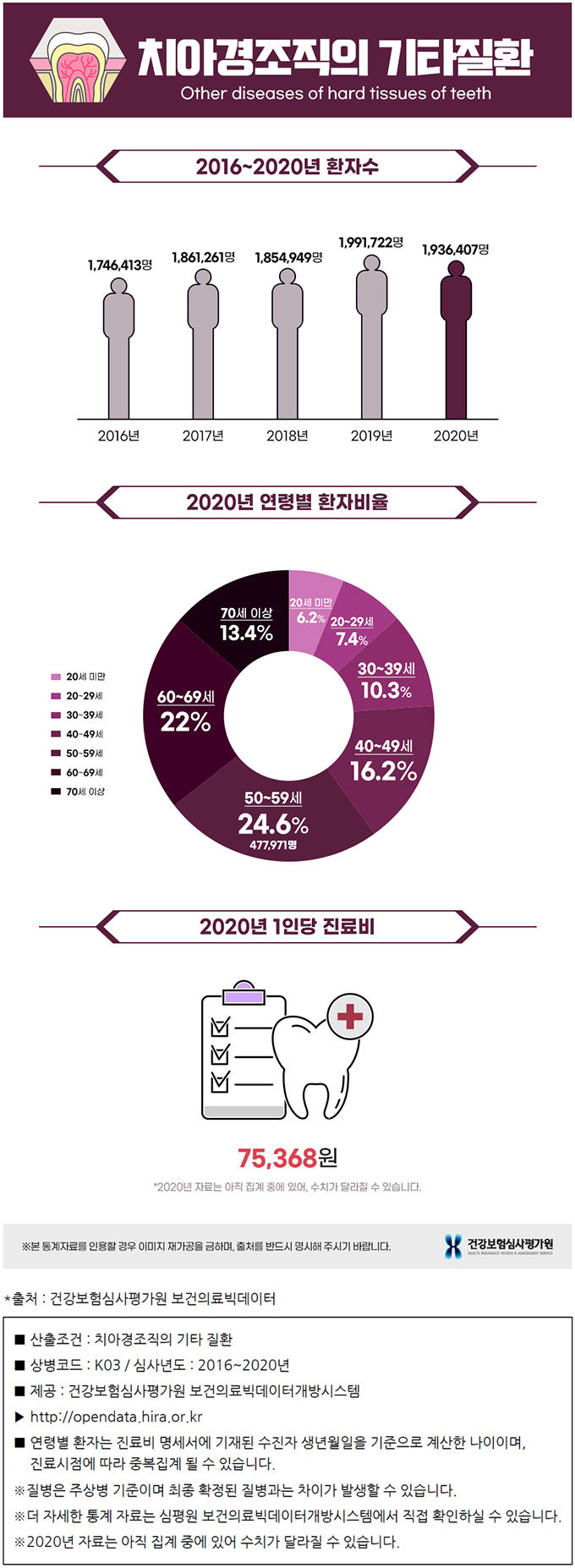 건강보험심사평가원의 통계에 따르면 2020년 치아경조직의 기타 질환으로 병원을 찾은 환자 중 50대가 24.6%로 가장 많았으며 60대가 22%로 그다음으로 많았습니다. 또한 치아경조직의 기타 질환은 주로 40대 이후의 중년에서 발생했으며 20세 미만의 환자는 적은 것으로 나타났습니다.