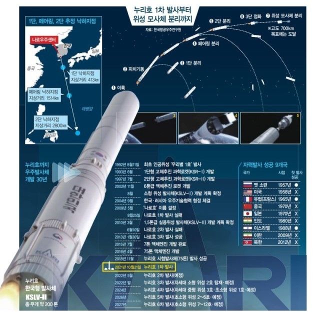 엄청난 굉음의 엔진 폭발 소리와 함께 이륙한 누리호는 목표 궤도인 우주 700km 고도까지 차분하게 비행을 이어갔어. 1, 2, 3단 분리도 잘 이뤄졌고. 그런데 마지막 단계에서 누리호에 실은 ‘더미 위성’(1.5톤 무게의 가짜 위성)의 속도가 충분히 나지 않아서 궤도에 안착하지 못하고 이탈했어. ‘절반의 성공’이란 평가가 나오는 이유지.