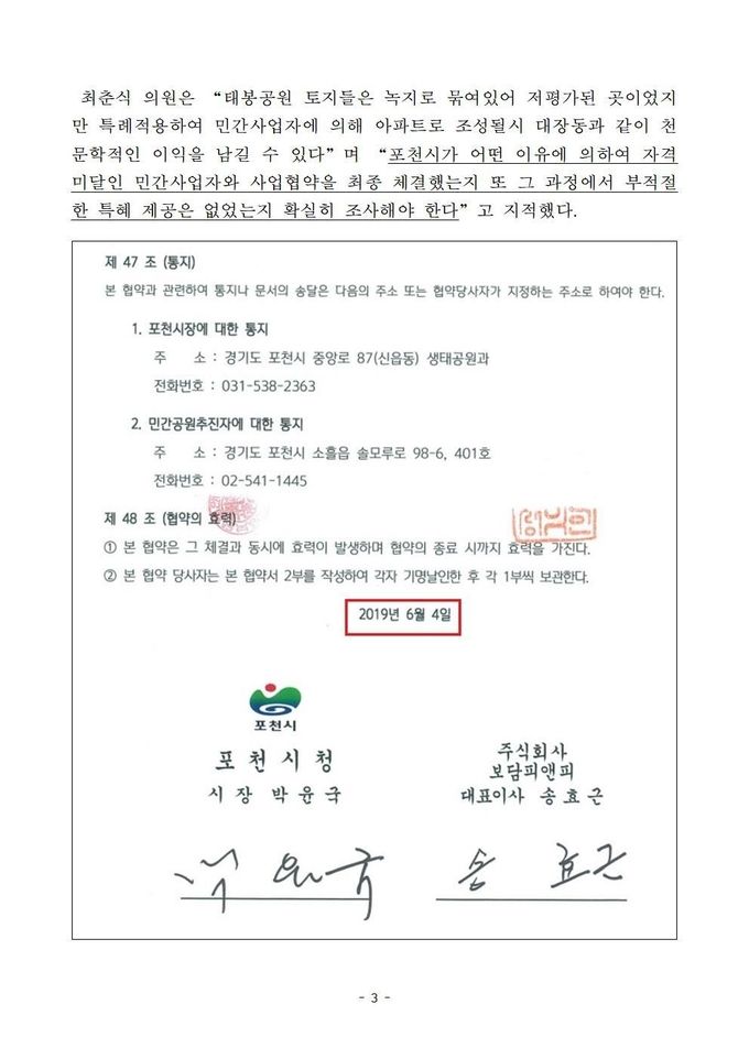 [한국방송/김국현기자] 국회 국민의힘 최춘식 의원(경기 포천시·가평군, 행정안전위원회 간사)은 포천시가 태봉공원 아파트 개발 사업을 추진하면서 자본금 3억원에 부채가 360억원인 ‘실적 없는 부실 신생업체’에 공식적으로 사업권을 준 것은 현 박윤국 포천시장이 사업협약서에 직접 사인했기 때문이라고 밝혔다.