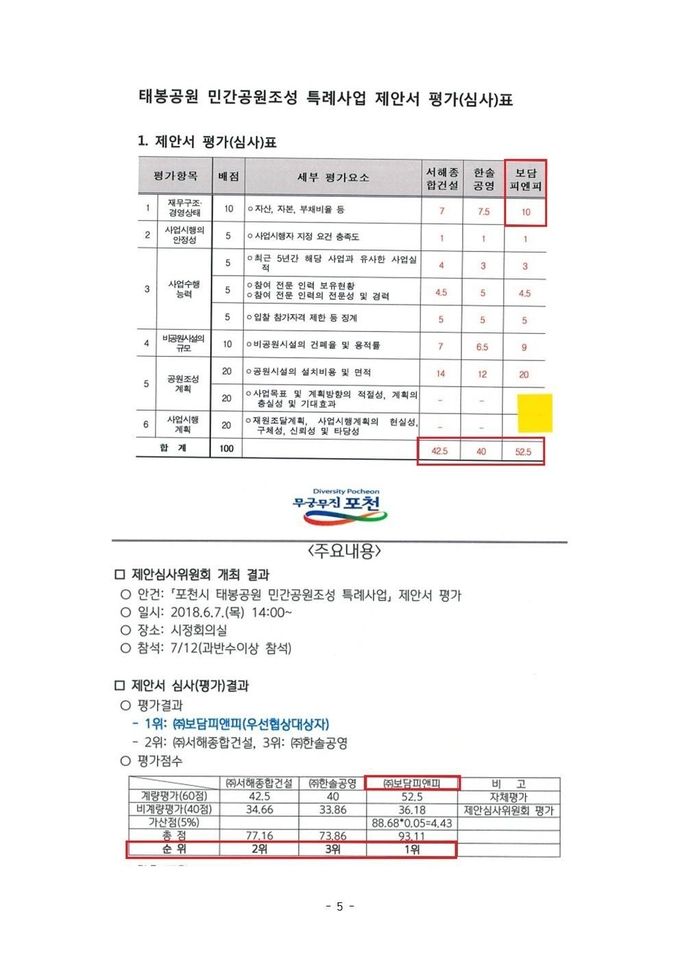 게다가 해당 업체는 2019년, 2020년 사업 매출실적도 전무한데, 포천시는 ‘사업실적 평가항목’에서도 5점 만점 중 3점으로 평가했다. 결국 보담피앤피는 종합평가 결과 타 업체들을 16~20점 높게 압도적으로 제치고 우선협상대상자 지정을 거쳐 박윤국 포천시장에 의하여 2019년 6월 4일 최종 사업자로 공식 지정됐다.