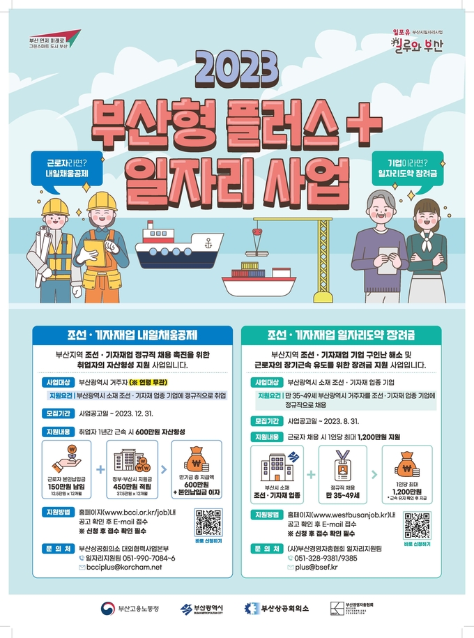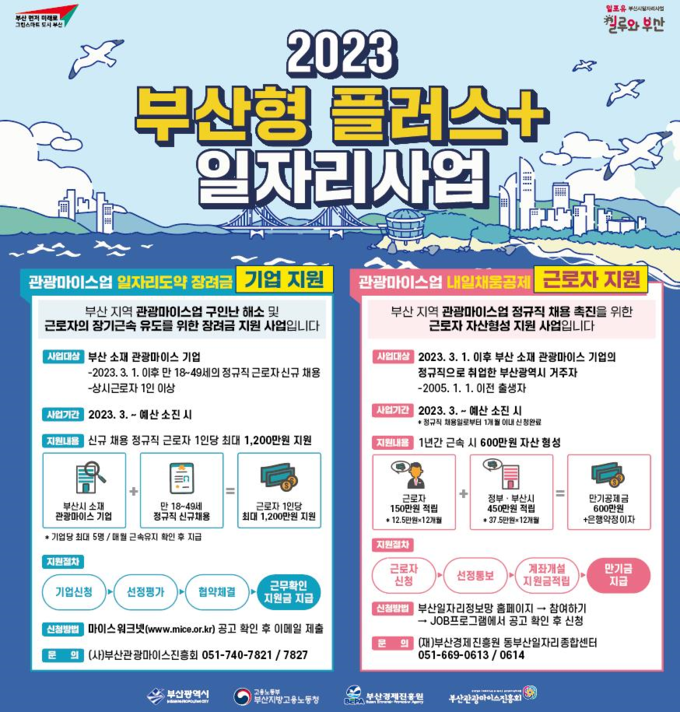 올해 처음 시작하는 「부산형 플러스 일자리 사업」은 고용노동부에서 지역 주력산업 구인난 해소를 위해 추진하는 「지역형 플러스 일자리 사업」 공모에 선정되어 추진하는 사업이다. 시는 최근 호경기에도 구인난이 심각한 조선·기자재업과 코로나19 위기를 지나 회복세에 들어섰음에도 직원 채용에 어려움을 겪는 관광·마이스업을 대상으로 사업을 추진한다.