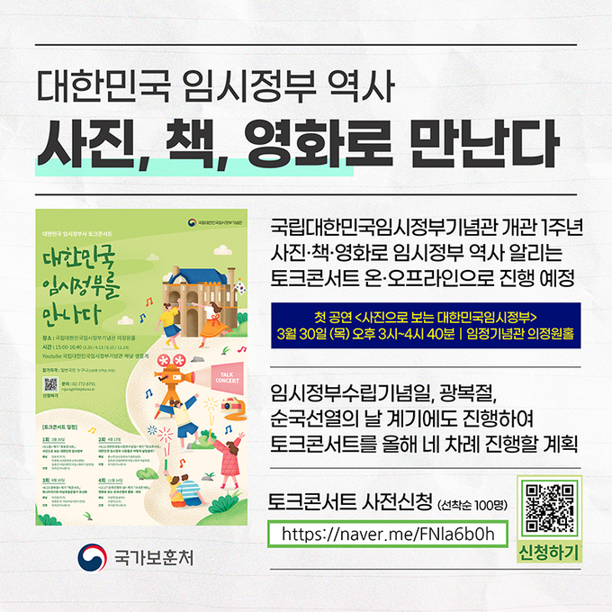 국립대한민국임시정부기념관 개관 1주년을 맞아 임시정부의 역사를 사진·책·영화를 활용한 이야기공연(토크콘서트)으로 만나는 자리가 마련된다.