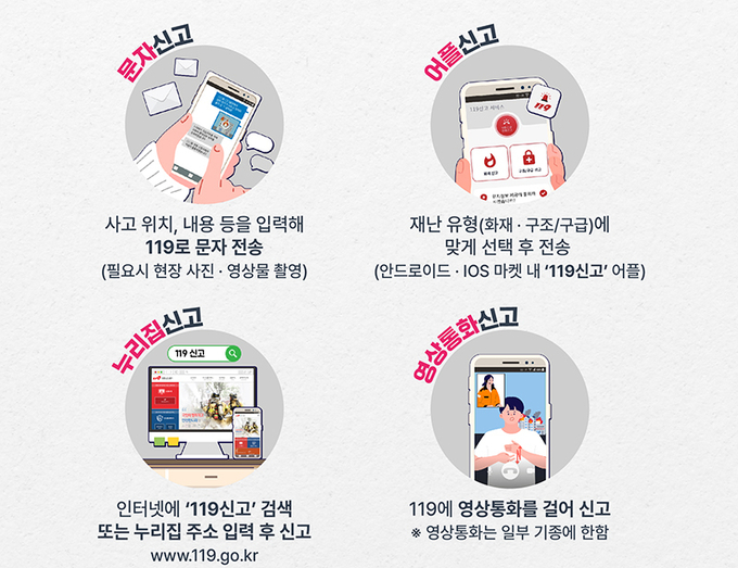 다매체신고는 사고 위치와 내용 등을 입력하는 119 문자와 ‘119신고’ 앱을 다운받아 이용하는 어플신고, 그리고 영상통화 신고와 누리집 신고 등이 있다.
