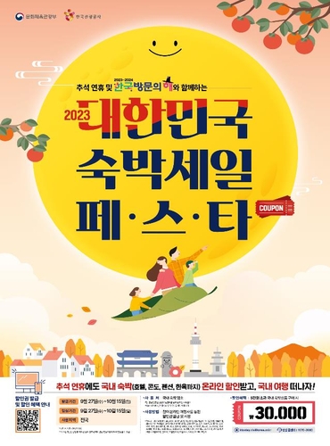 [한국방송/박기문기자] 문화체육관광부(장관 박보균, 이하 문체부)는 한국관광공사와 함께 지난 6월 큰 호응을 얻었던 숙박 할인권을 재개해 '추석 연휴와 함께하는 대한민국 숙박세일 페스타'를 진행한다. 당초 숙박 할인권은 여행 비수기인 11월에 배포할 예정이었으나, 10월 2일 임시공휴일 지정으로 생겨난 황금연휴를 국내 여행 활성화의 기회로 활용하고자 시기를 당겨 추석 연휴에 30만 장을 배포한다.