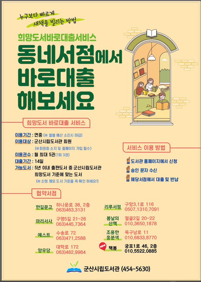 또한 군산시는 1월부터 사전공모와 실태조사를 통해 ▲어린이서점 책봄(조촌동) 한 곳을 추가로 선정했다. 이로써 ▲마리서사▲양우당▲예스트▲한길문고▲리빙룸루틴▲봄날의 산책▲조용한 흥분색 등 기존 서점 7곳을 포함하여 올해는 총 8곳의 희망도서 바로 대출 서비스 협약서점을 확보했다.
