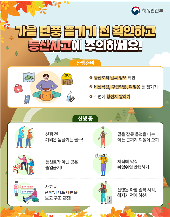 행정안전부(장관 윤호중)는 가을 단풍철을 맞아 산행 시 실족이나 조난 등 안전사고 예방에 각별히 주의할 것을 당부했다.