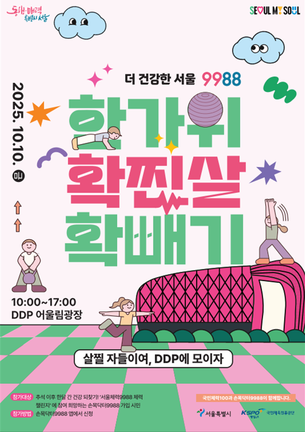 보름 후 중간 점검은 25일(토), 여의도 이벤트 광장에서 열릴 ‘9988 건강가득 대축제(가칭)’에서 진행될 예정이다. 최종 체력측정은 11월 10일 이후 ‘서울시 체력인증센터’에서 한 달간 생활 습관 개선 성과를 직접 확인하는 자리를 갖는다.