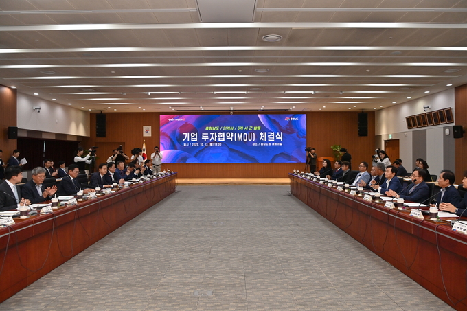 김태흠 지사는 13일 도청 대회의실에서 김석필 천안시장권한대행 등 6개 시군 단체장, 한민석 웨이비스 대표이사 등 21개 기업 대표 등과 투자협약을 체결했다.