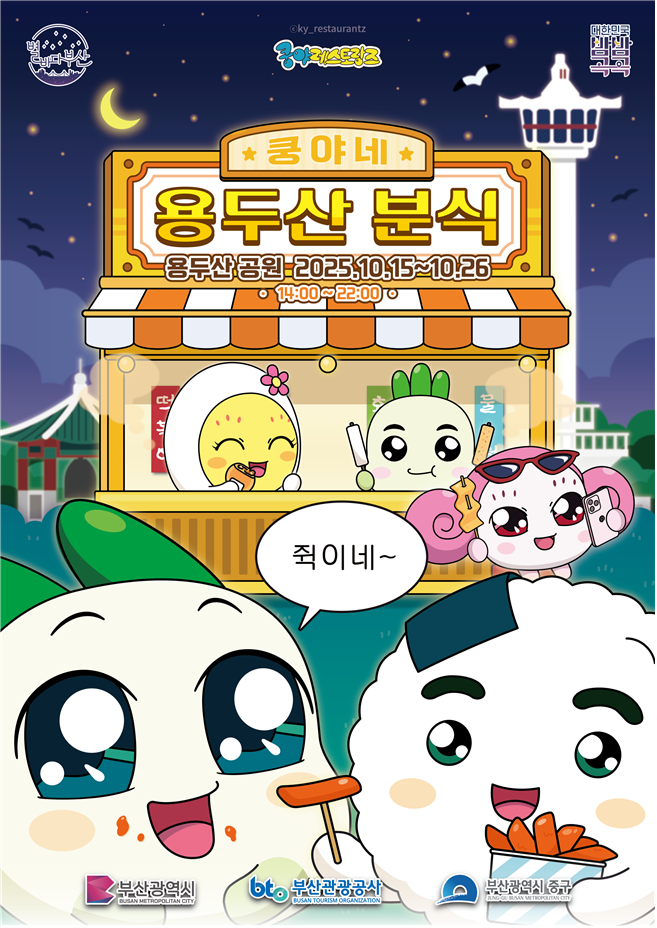 [부산/문종덕기자] 부산시(시장 박형준)는 부산관광공사(사장 이정실)와 오늘(15일)부터 10월 26일까지 용두산공원에서 「별바다부산 나이트 팝업 시즌3」(이하 팝업)으로 '쿵야네 용두산 분식 팝업'을 운영한다고 밝혔다.