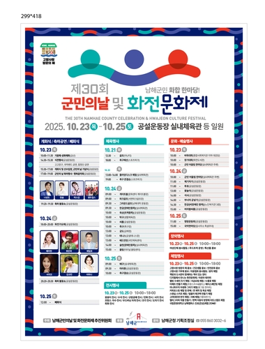 남해군민의날추진위원회(이하 추진위원회)는 오는 10월 23일부터 25일까지 3일간 남해공설운동장과 실내체육관 일원에서 '제30회 군민의 날 및 화전문화제'를 개최한다.