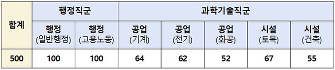 이에 국가공무원 7급 공개채용시험을 추가 시행하는 바, 각 산업에 특화된 근로감독 및 산업재해 예방 강화를 목적으로 과학기술직군 300명과 행정직군 200명 등 총 500명을 선발한다.