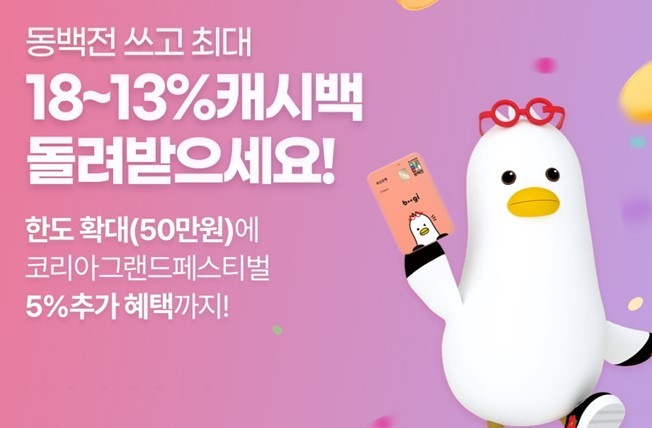 11~12월의 캐시백 요율은 9~10월과 같이 최대 13퍼센트(%)를 유지하되, ‘코리아 그랜드 페스티벌’ 기간(10.29.~11.9.)에만 한시적으로 ▲최대 18퍼센트(%) 캐시백 요율을 적용하고 ▲50만 원의 별도 한도를 추가 적용하는 것이다. 이에 따라 ‘코리아 그랜드 페스티벌’ 기간에는 50만 원 사용 시 최대 9만 원을 환급받을 수 있다.